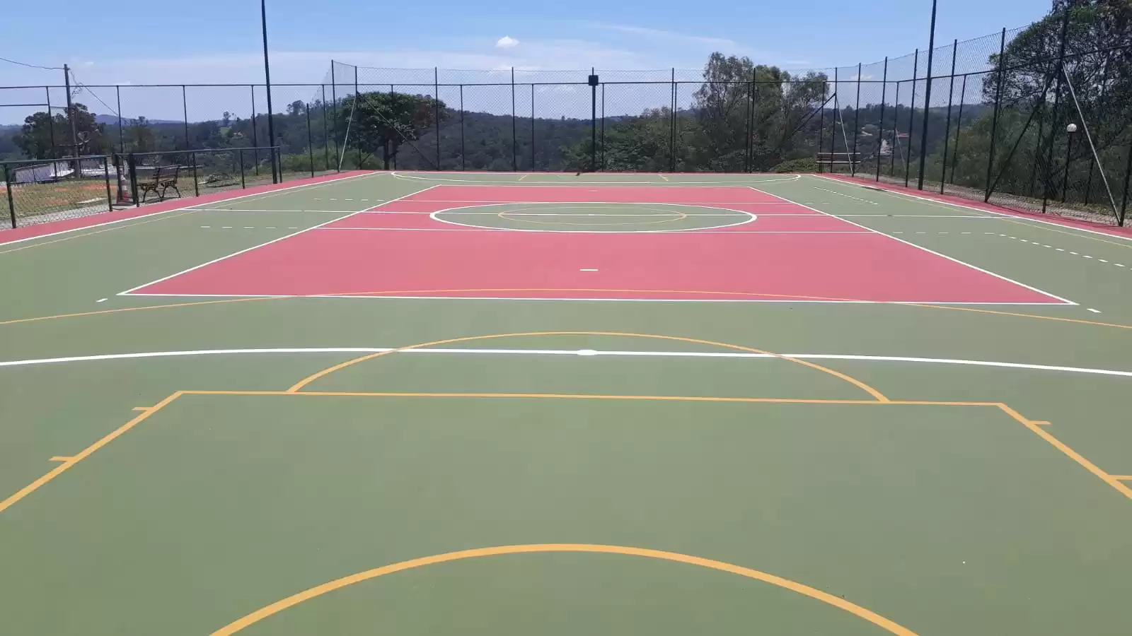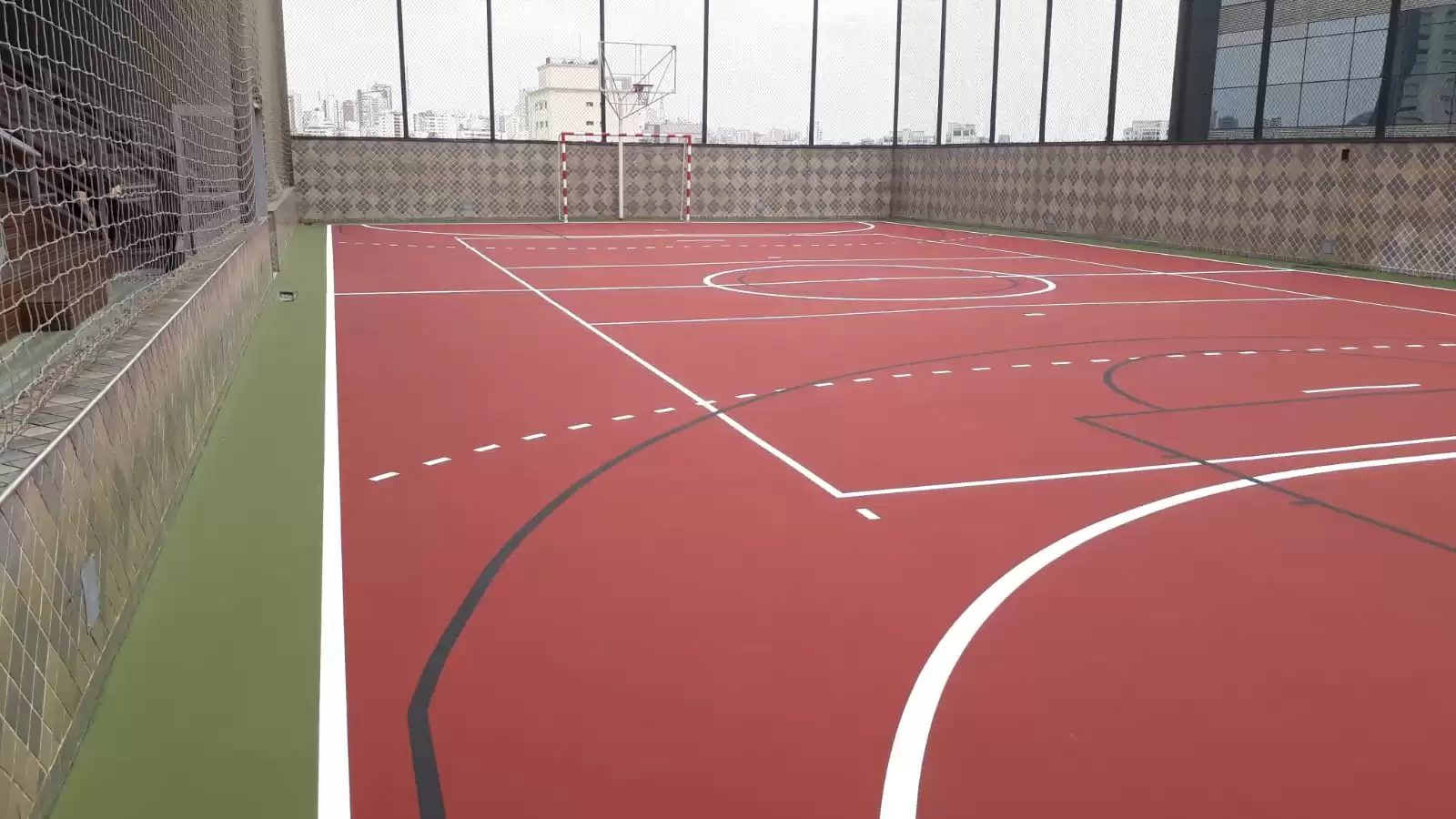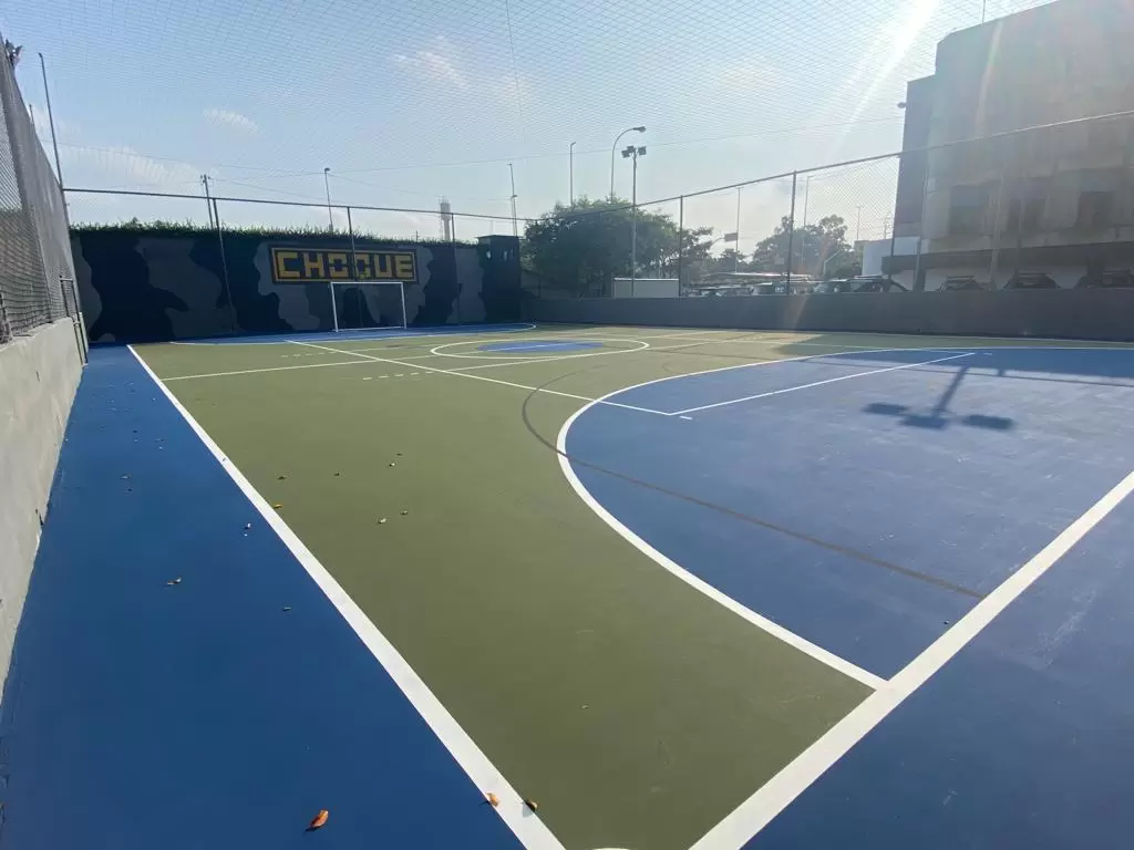 A Top Quadra PolySports possui superfície de alto desempenho, projetada para absorver impactos e oferecer flexibilidade ideal, suportando uma variedade de esportes. O piso é construído com materiais de alta resistência, incluindo uma base de concreto ou asfalto, complementada por marcações precisas para cada modalidade esportiva. Cada detalhe é meticulosamente planejado, desde a composição do asfalto até o uso de pinturas e adesivos especiais que garantem linhas demarcatórias duradouras e visíveis.